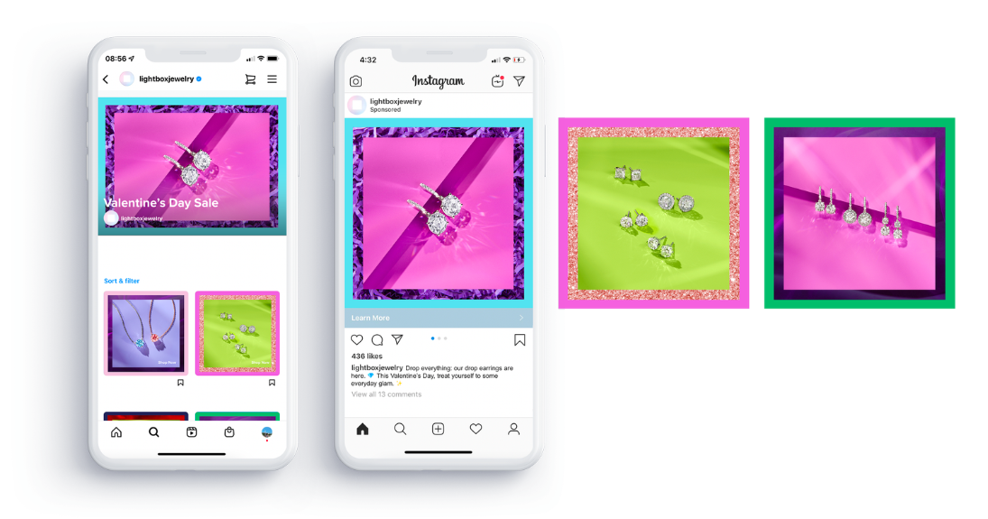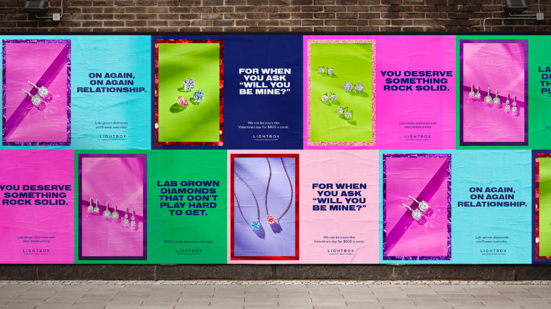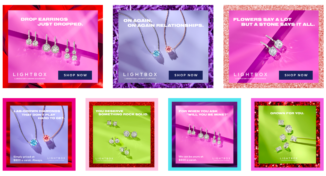 Lightbox is a lab-grown diamond company offering diamonds that are indistinguishable from mined ones at affordable prices. On Valentine’s day 2023, we revamped typical Valentine’s Day language to be more playful, exuberant, and fun while doing away with the usual sappy or saccharine. We also reinvented the typical world of red and pink and entering a world of bold, bright colors and visually exciting textures that add a sense of depth.